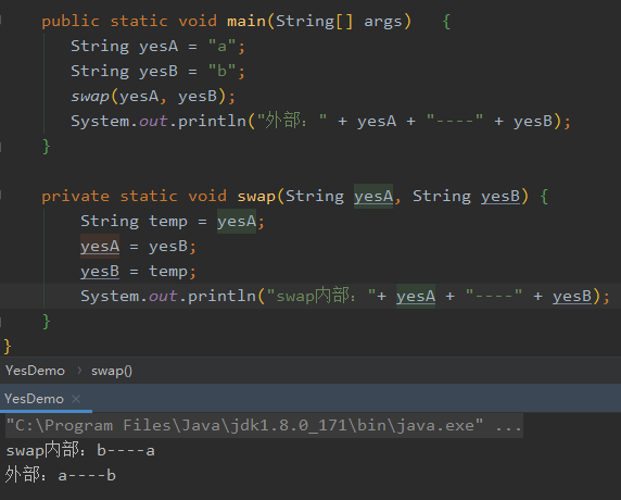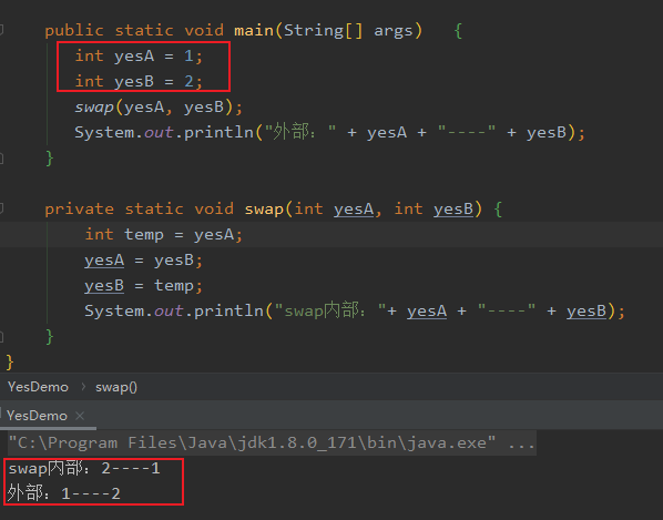 然后,我们都听过 Java 中只有值传递,也就是调用方法的时候 Java 会把变量 yesA 的值传递到方法上定义的 yesA(同理 yesB 也是一样),只是值传递。