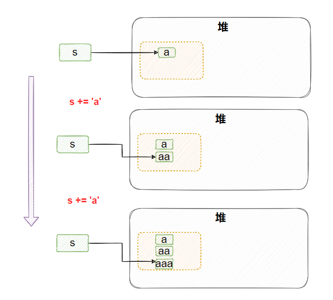 因为无法被修改,所以像执行s += "a"; 这样的方法,其实返回的是一个新建的 String 对象,老的 s 指向的对象不会发生变化,只是 s 的引用指向了新的对象而已。