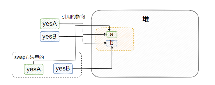 然后调用了 swap 方法,调换了 yesA 和 yesB 的值(也就是它的引用)