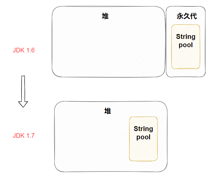 在 JDK 1.6 的时候字符串常量池是放在永久代的,而 JDK 1.7 及之后就移到了堆中。