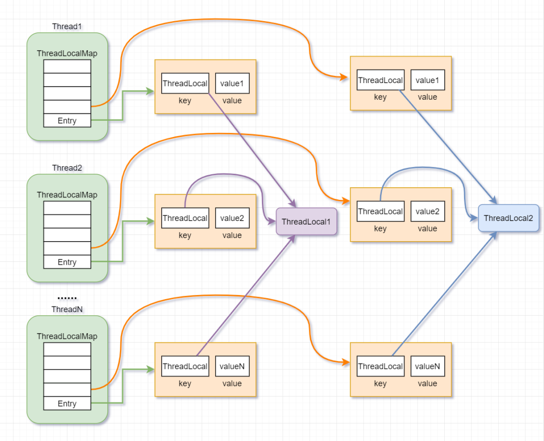 ThreadLocal,即线程本地变量(每个线程都有自己唯一的一个哦),是一个以ThreadLocal对象为键、任意对象为值的存储结构。底层是一个ThreadLocalMap来存储信息,key是弱引用,value是强引用,所以使用完毕后要及时清理(尤其使用线程池时)。