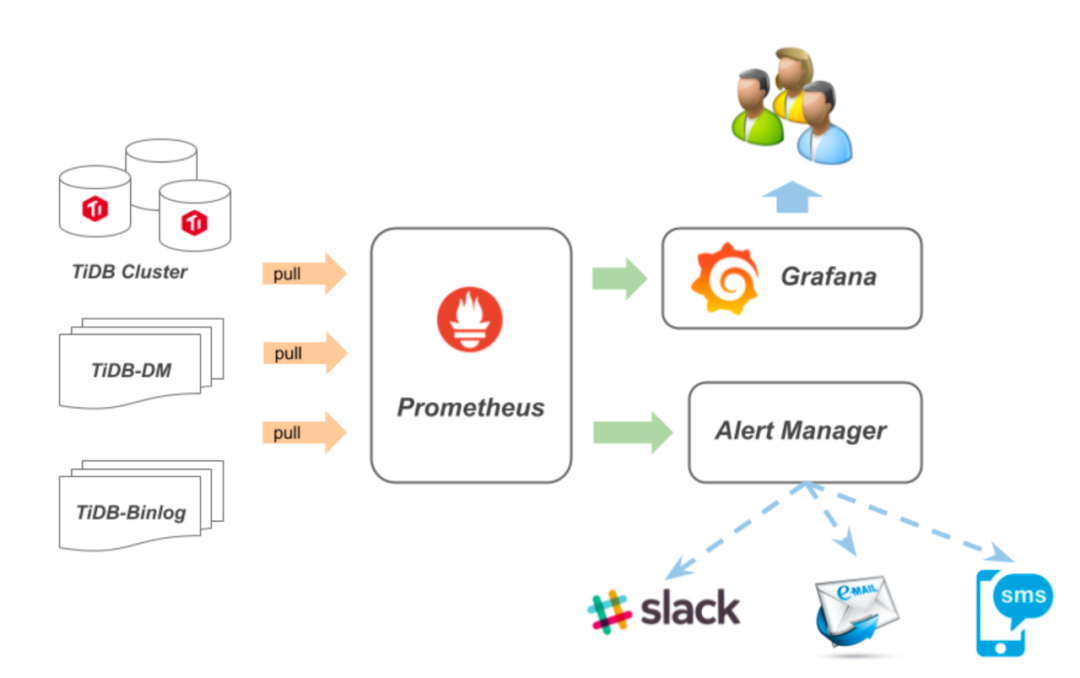 下图为Prometheus的工作流程,可以简单理解为:Prometheus server定期拉取目标实例的采集数据,时间序列存储,一方面通过配置报警规则,把触发的报警发送给接收方,一方面通过组件Grafana把数据以图形化形式展示给用户。